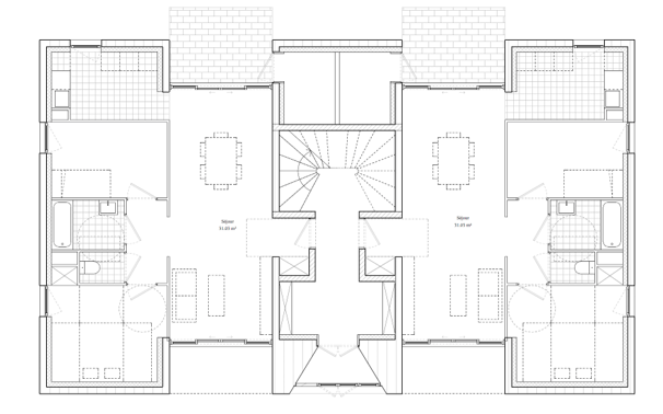 Les 25 logements se divisent en 4 bâtiments R+1, organisés autour d’un coeur d’îlot qui connecte l’ensemble du programme. Par leurs hauteurs et leurs profils, les constructions s’insèrent harmonieusement dans le tissu urbain du quartier.