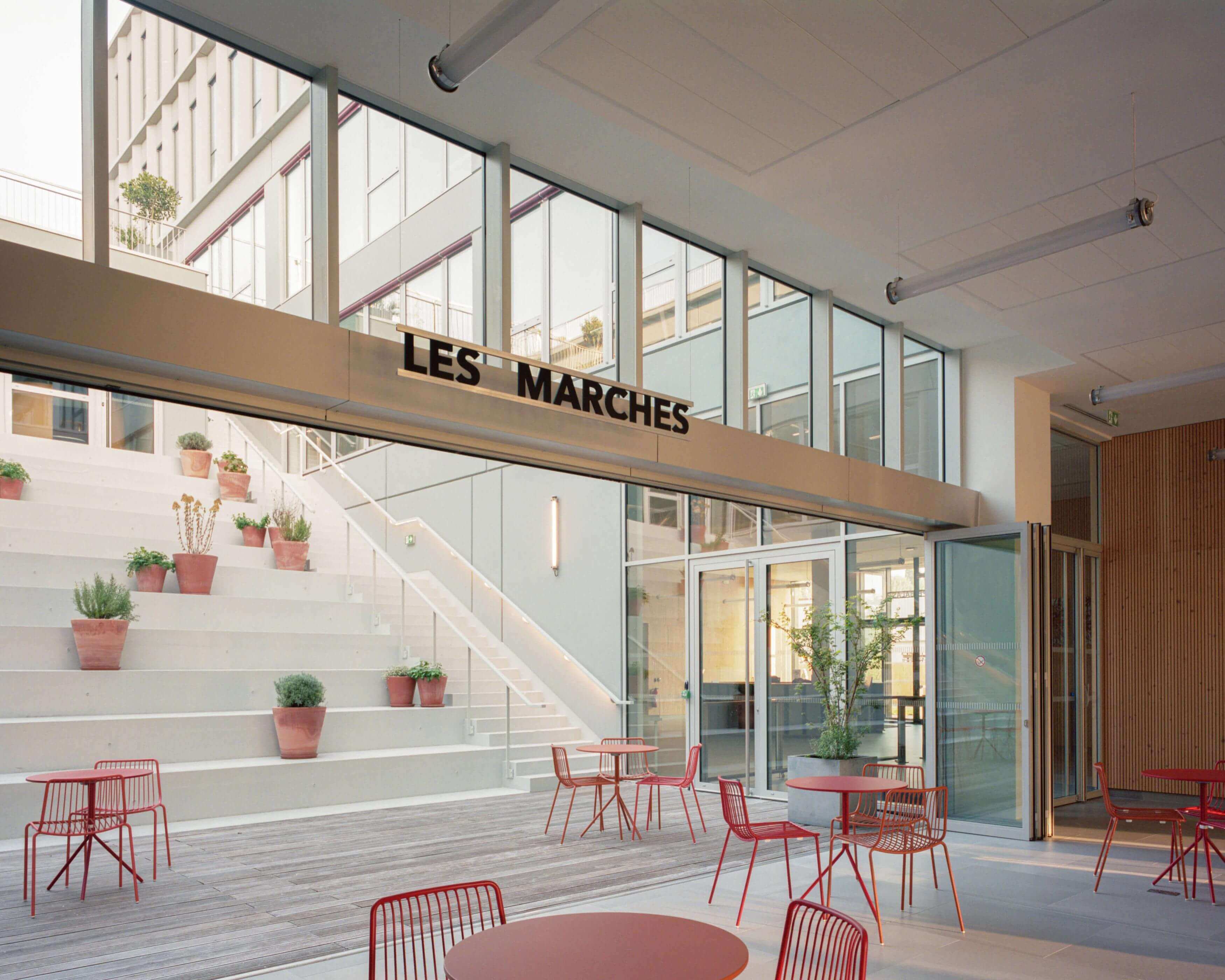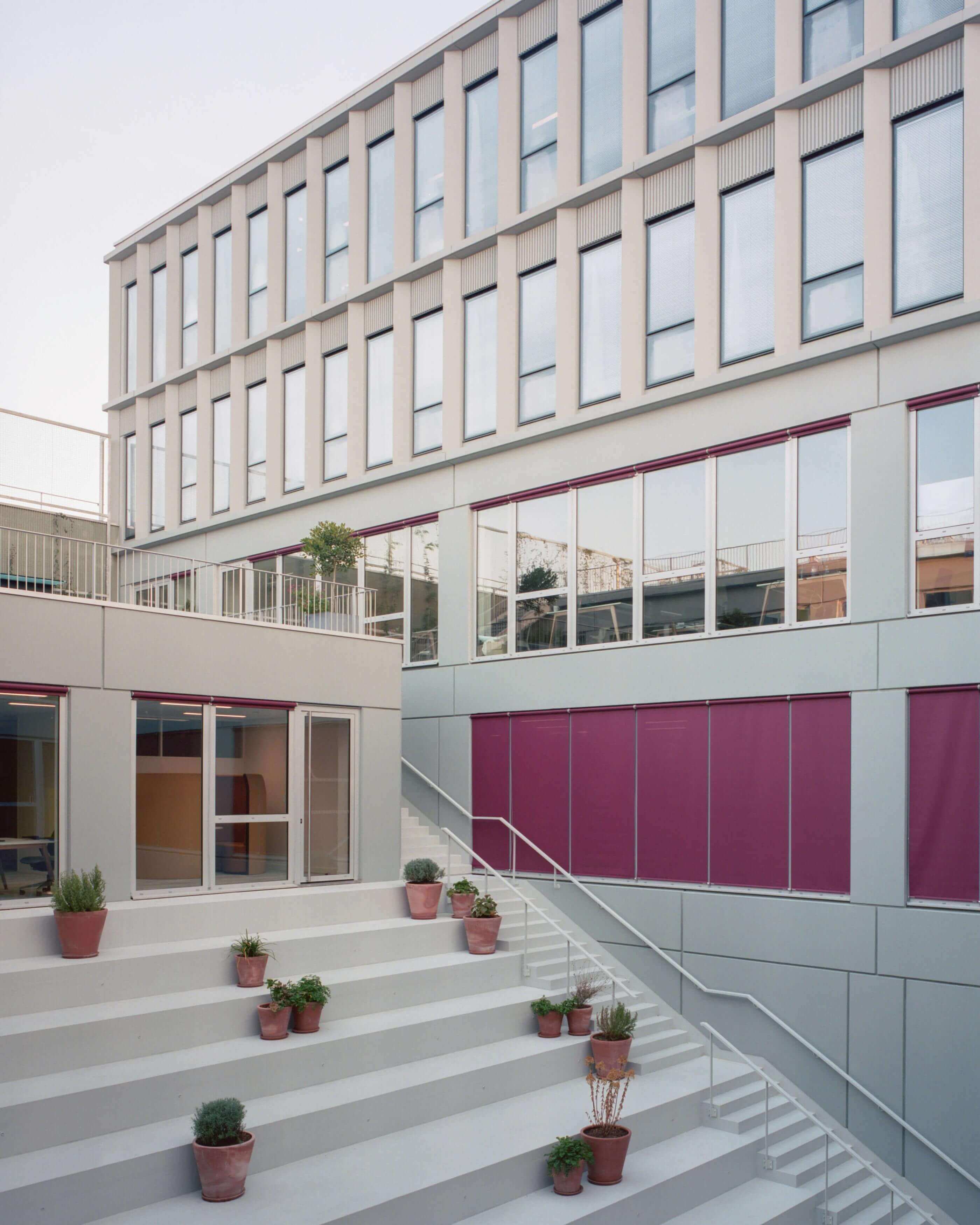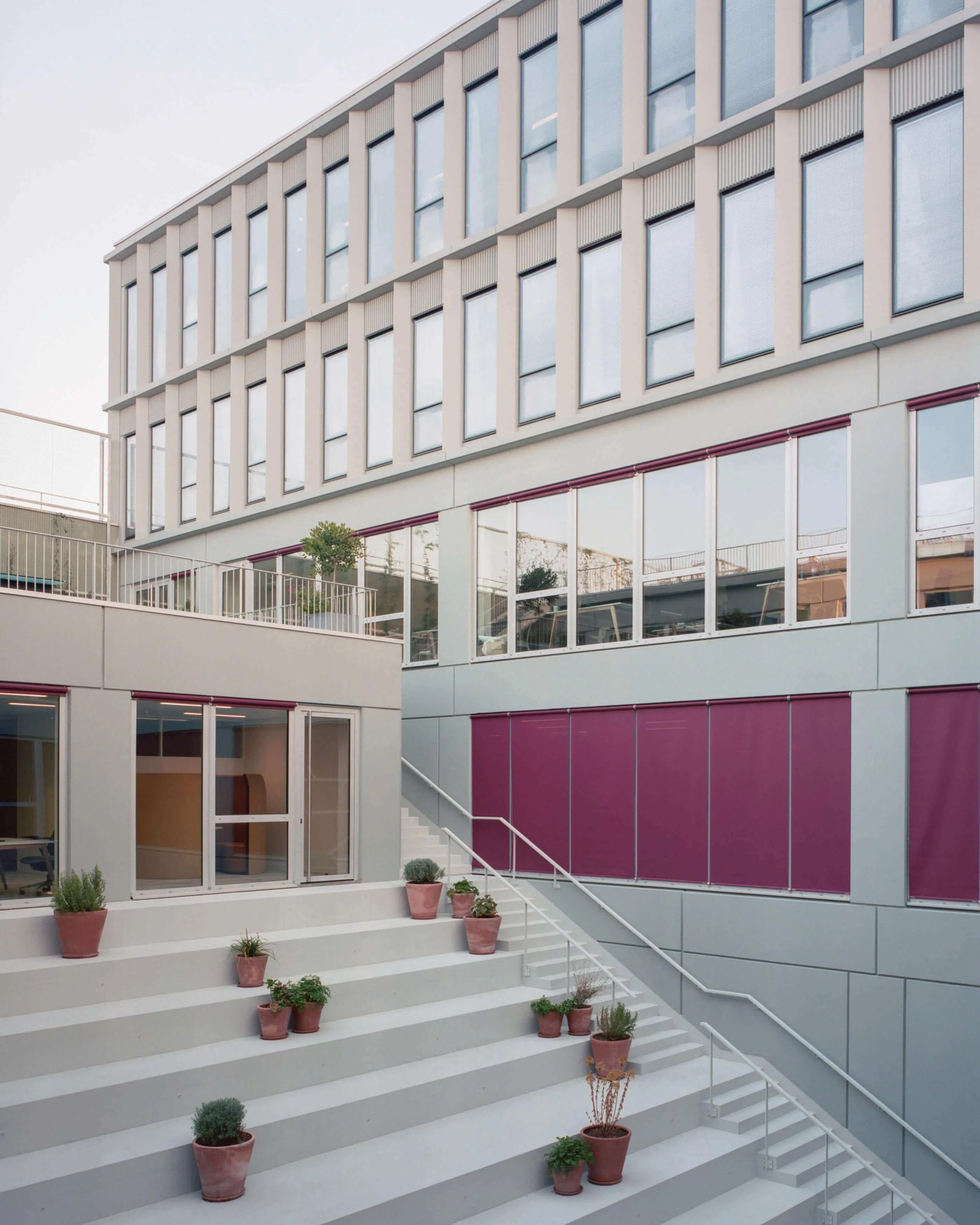 L'immeuble de bureaux s'articule autour d'un patio central en forme de gradins. Ce dispositif propose un parcours progressif depuis le rez-de-chaussée vers la terrasse du R+3. Les différents plateaux de bureaux sont donc reliés les uns aux aut res par une succession d'espaces extérieurs, augmentant ainsi la proportion des espaces éclairés naturellement.