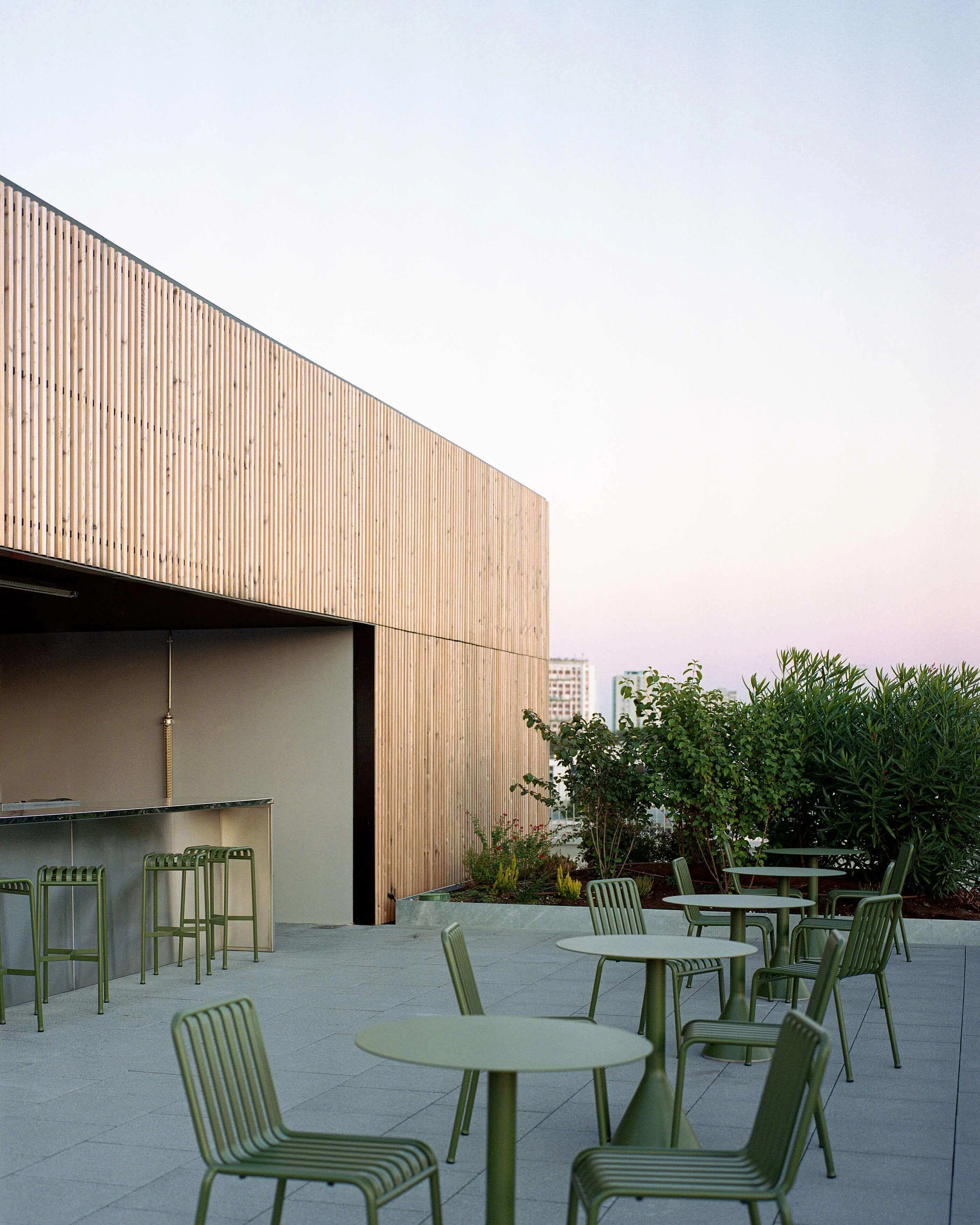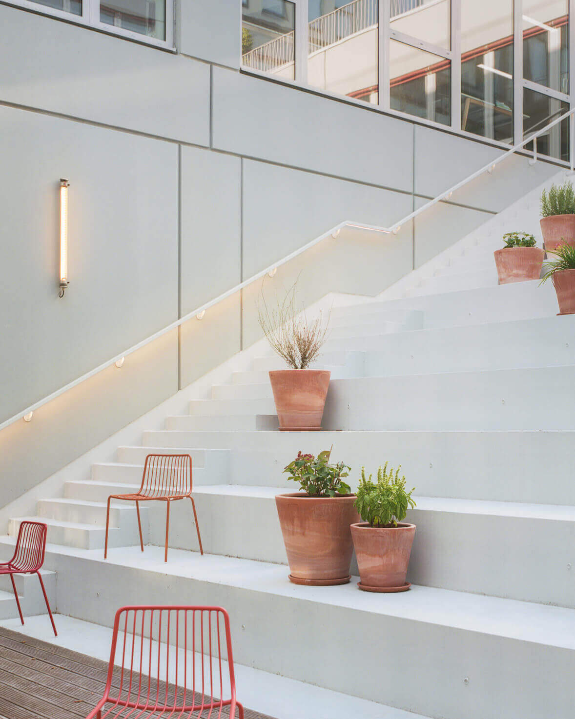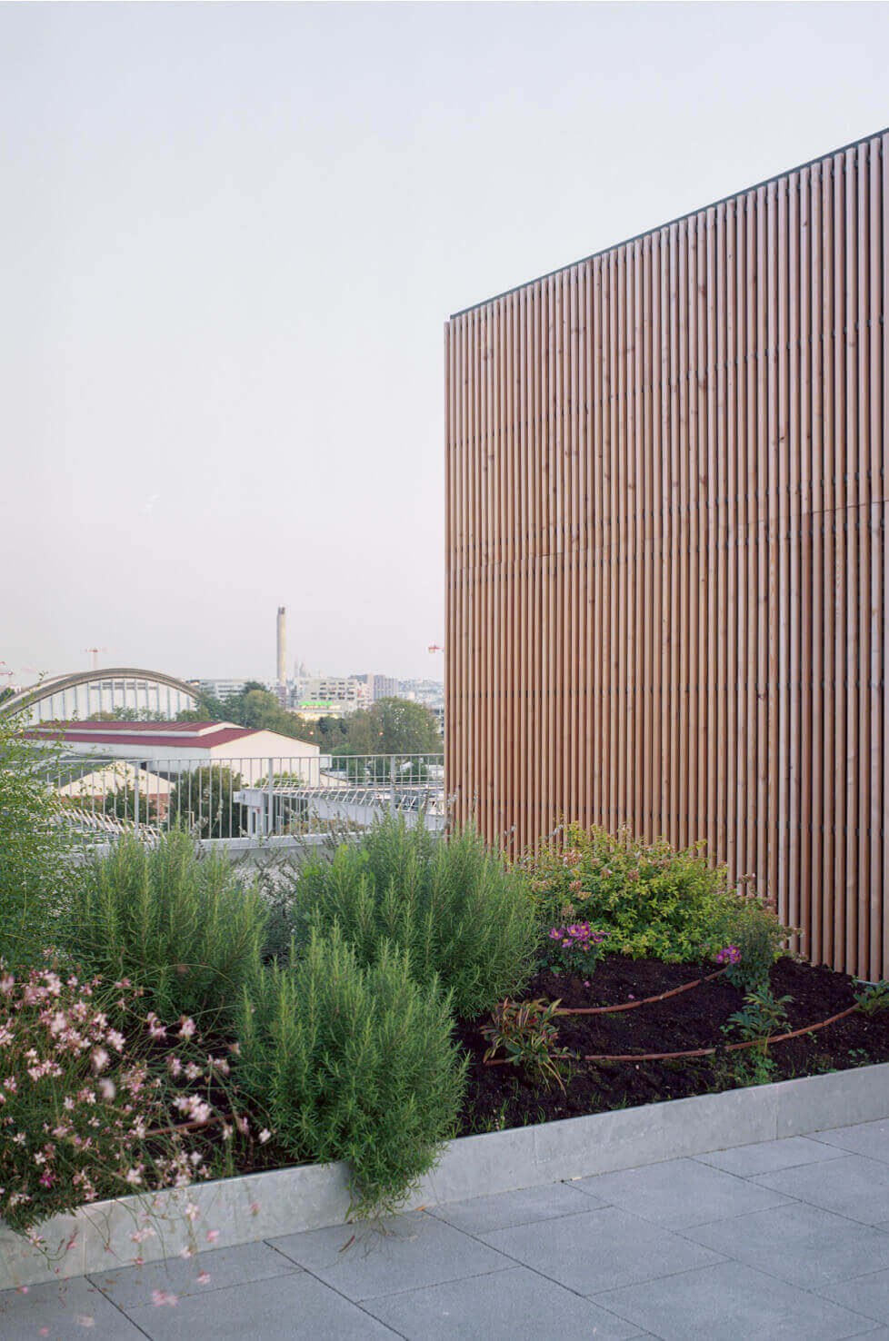 L'immeuble de bureaux s'articule autour d'un patio central en forme de gradins. Ce dispositif propose un parcours progressif depuis le rez-de-chaussée vers la terrasse du R+3. Les différents plateaux de bureaux sont donc reliés les uns aux aut res par une succession d'espaces extérieurs, augmentant ainsi la proportion des espaces éclairés naturellement.