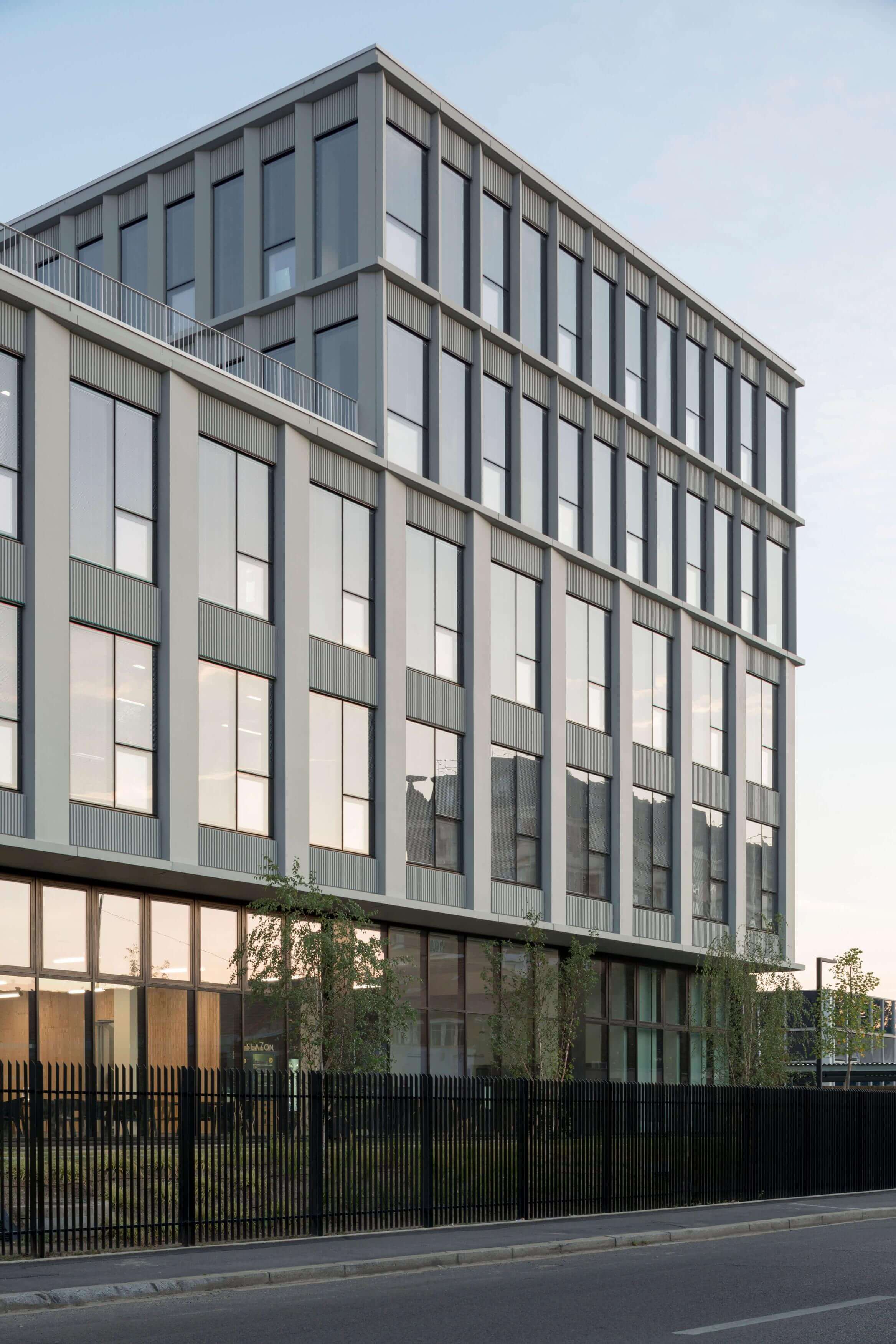 Il se compose en effet de 3 volumes principaux (le soubassement, le corps et l'émergence) en béton brut ou revêtus de bardage métallique. Par ailleurs,la moitié de son emprise est occupée par un parking "réversible" en superstructure conçu de façon à pouvoir être transformé en bureaux sur tout ou partie de sa surface.