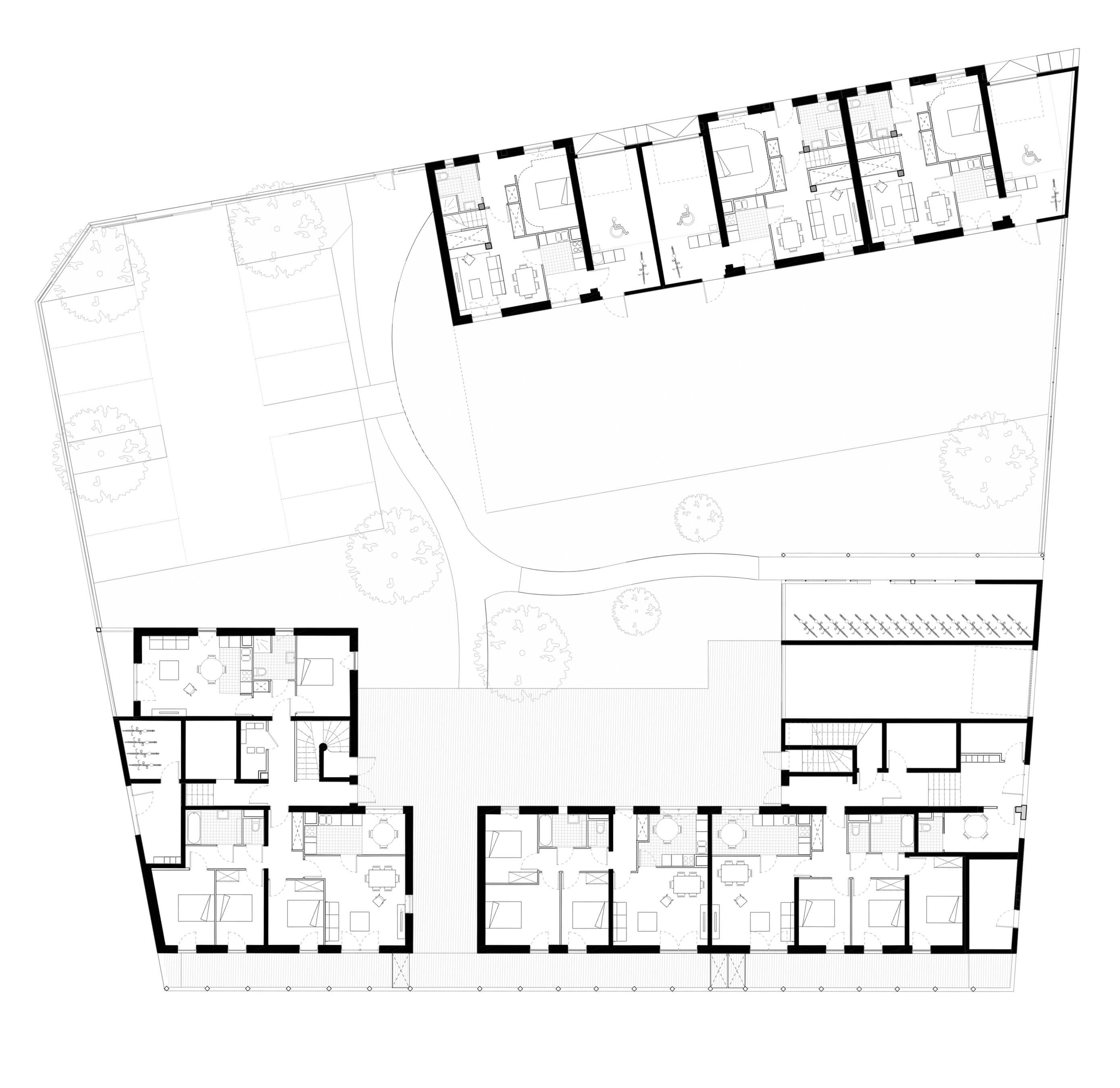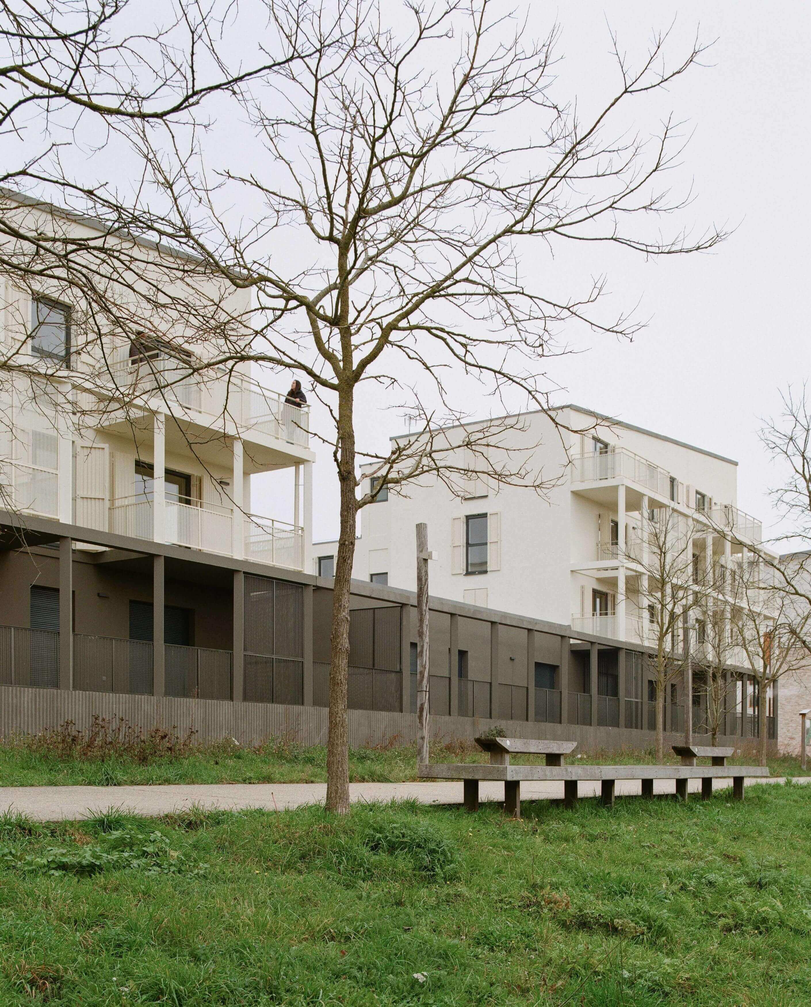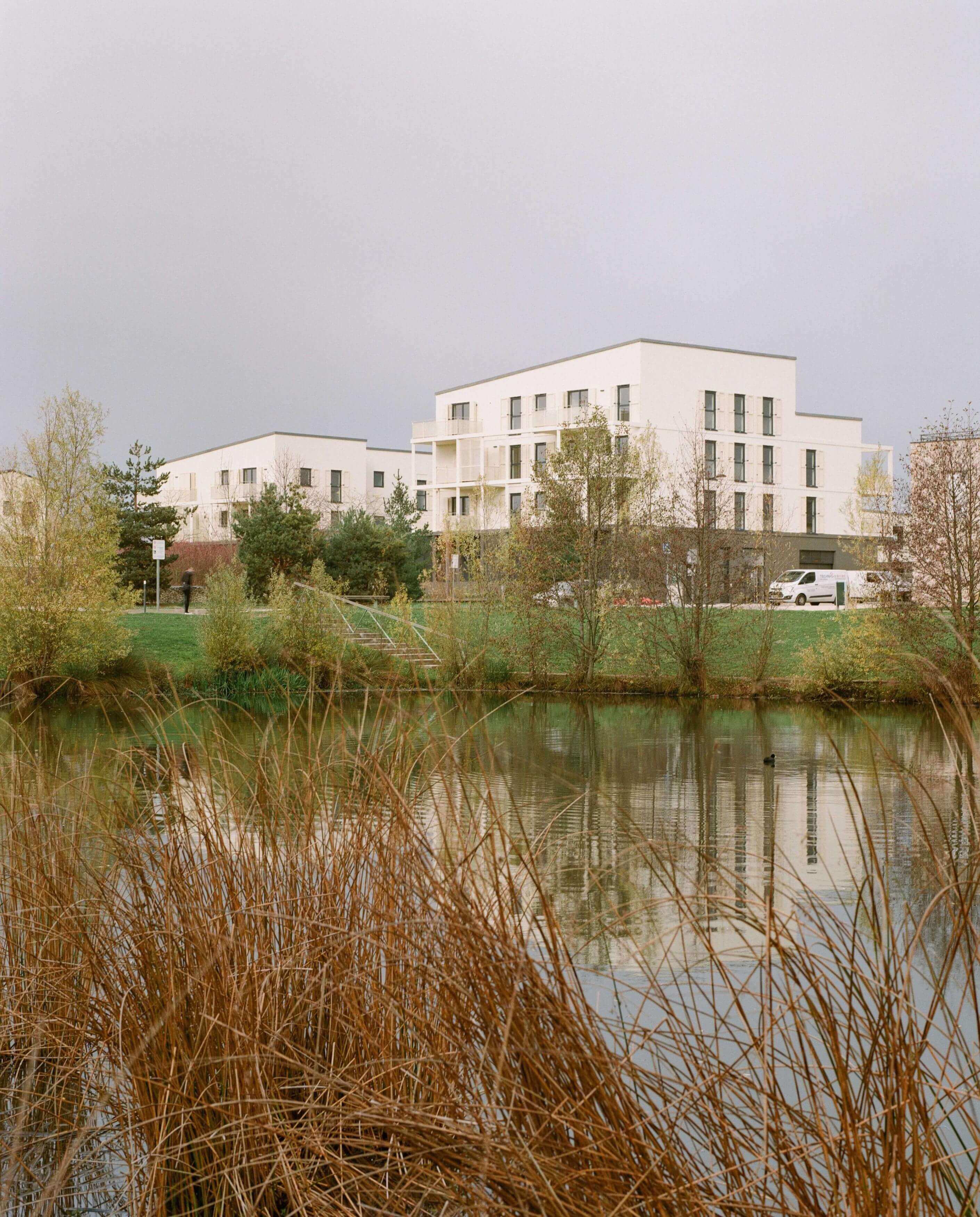 Cet ensemble s’inscrit dans la continuité des immeubles qui longent le canal et sa volumétrie marquée par un épannelage décroissant depuis le R+3 vers le R+2 affirme une transition depuis la ville vers la forêt.