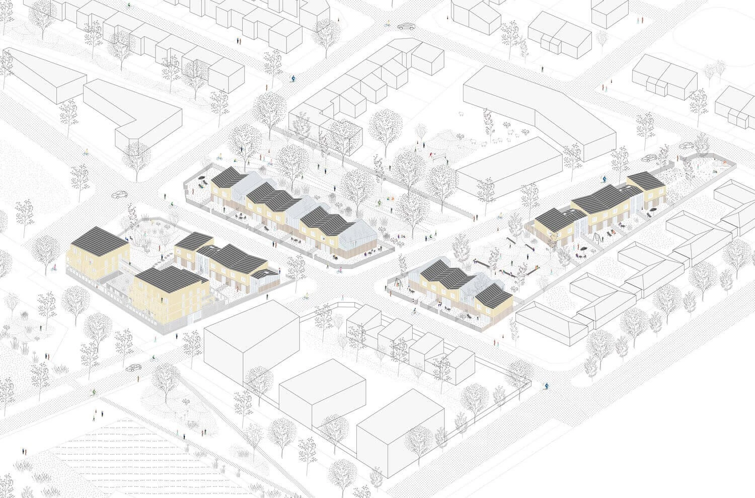La volumétrie de l’immeuble de logement collectif devient décroissante pour garantir une articulation progressive depuis le canal vers le coeur du quartier et les parcelles accueillants les maisons individuelles groupées.