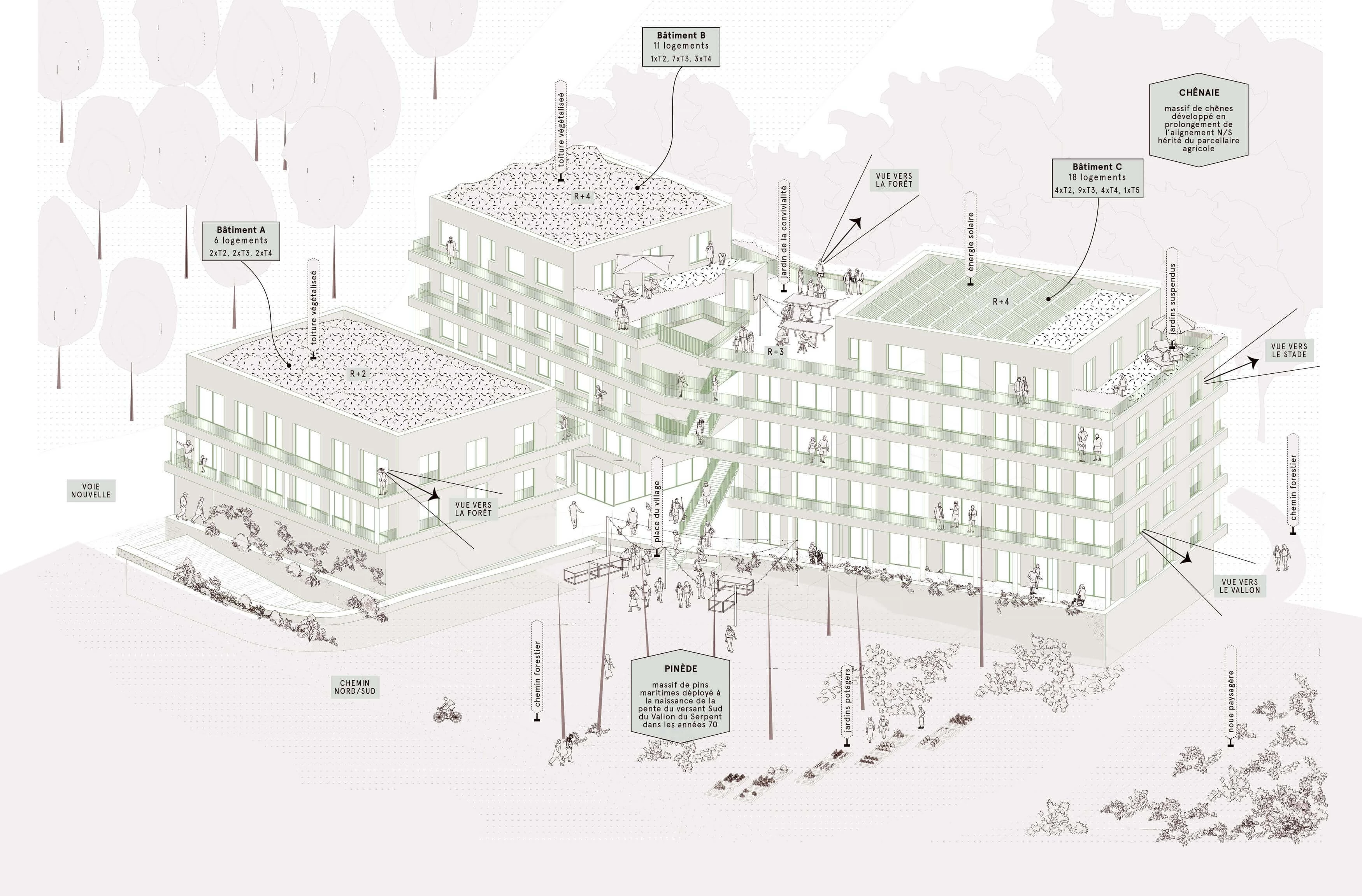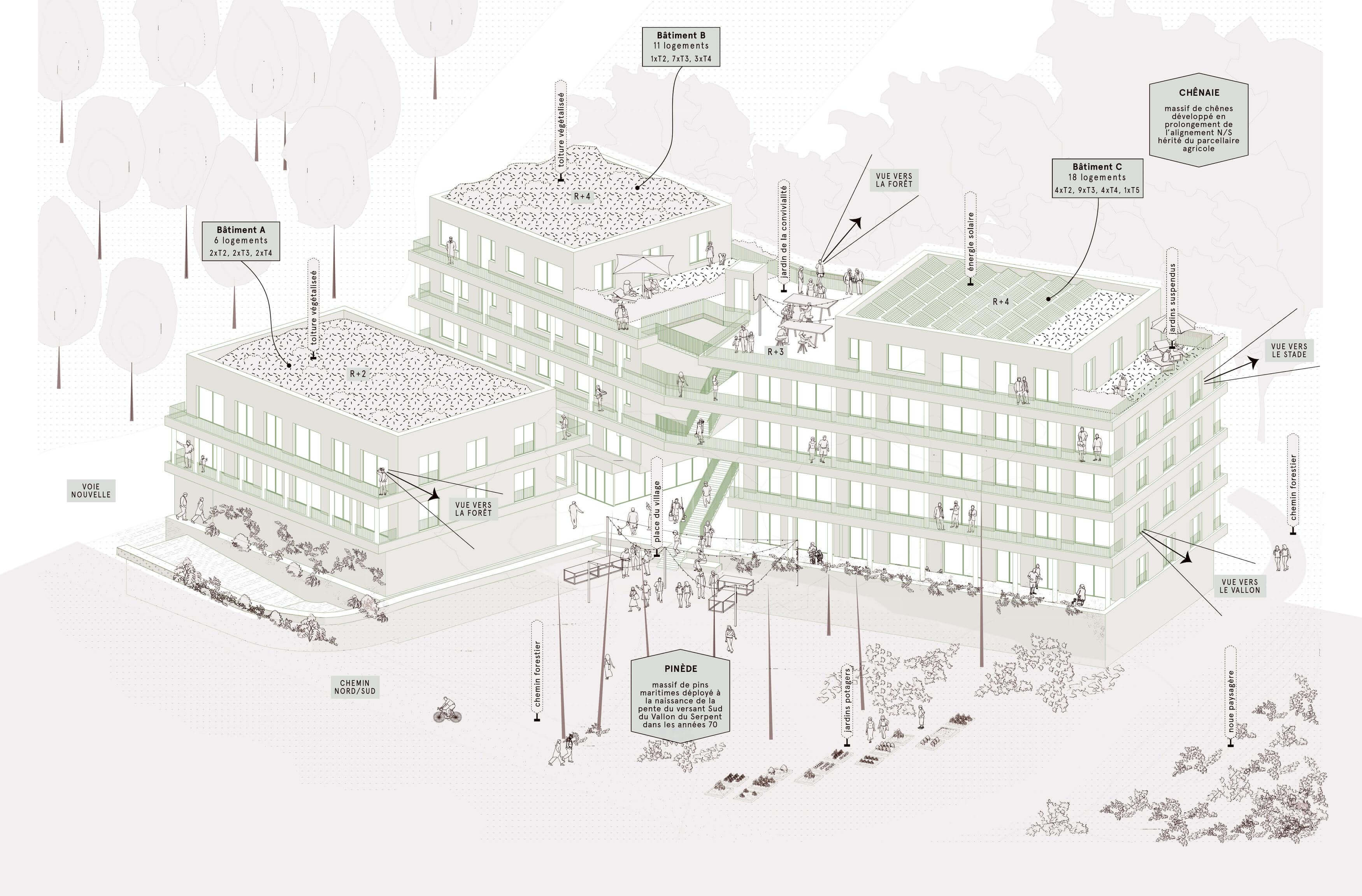 Notre projet vise l'épanouissement de la collectivité des habitants dans une proximité entretenue avec un environnement remarquablement précieux. Organiser la vie des habitants selon des règles qu'ils se fixeront eux-mêmes, entre collectivité et privacité, est un des objectifs de notre parti d'implantation qui favorise des espaces d'expression intimes tout en préservant des surfaces de sociabilité et d'échanges importants.