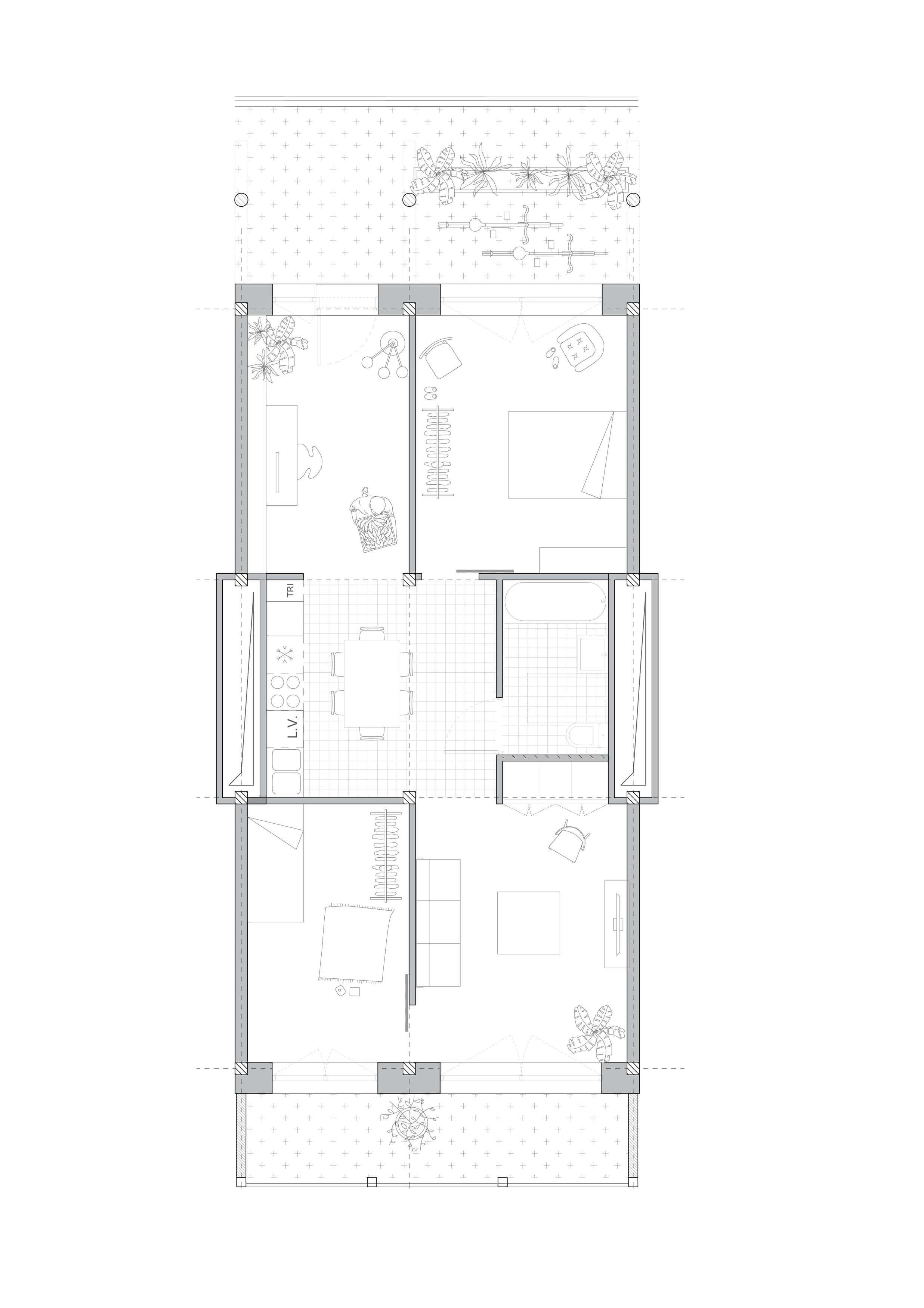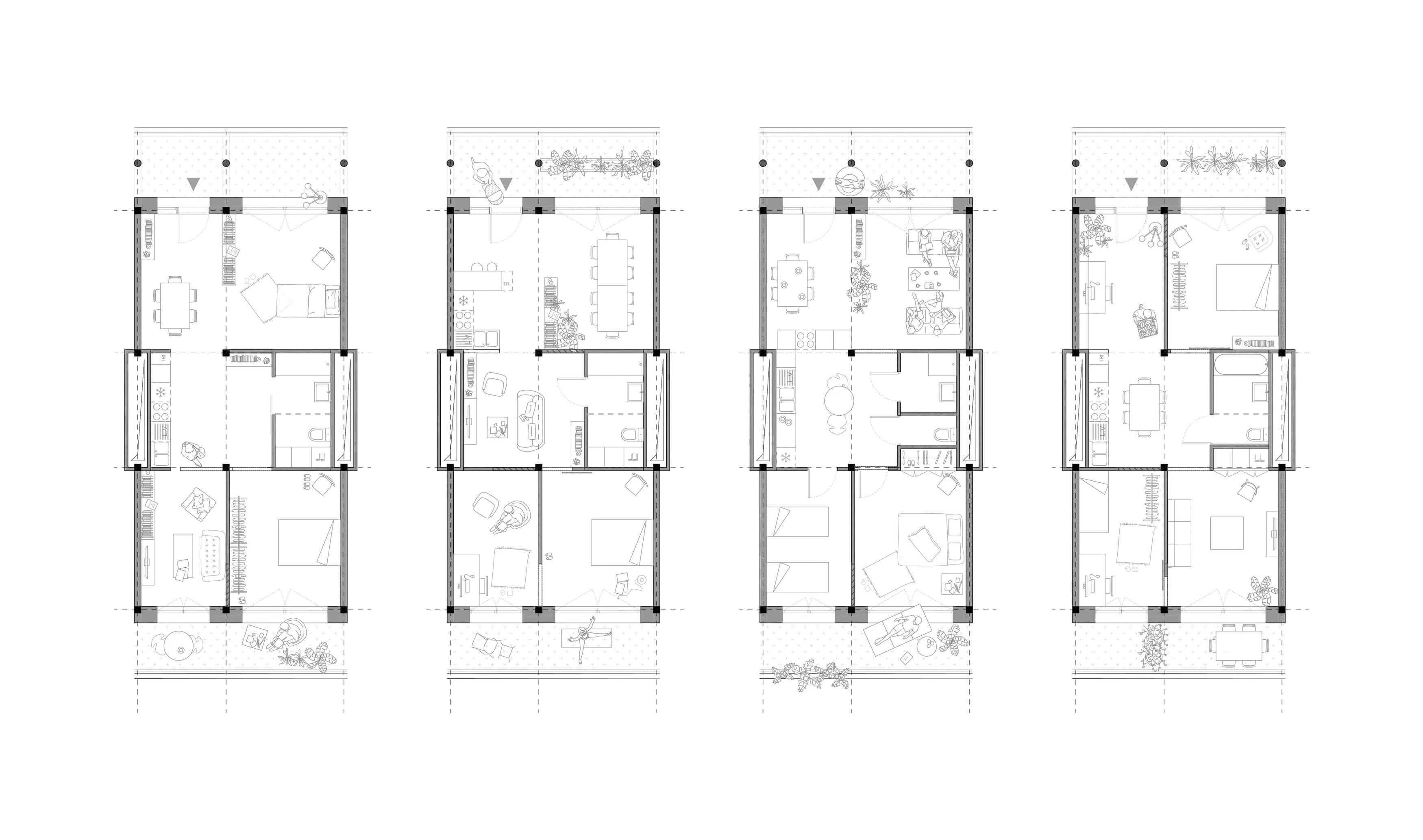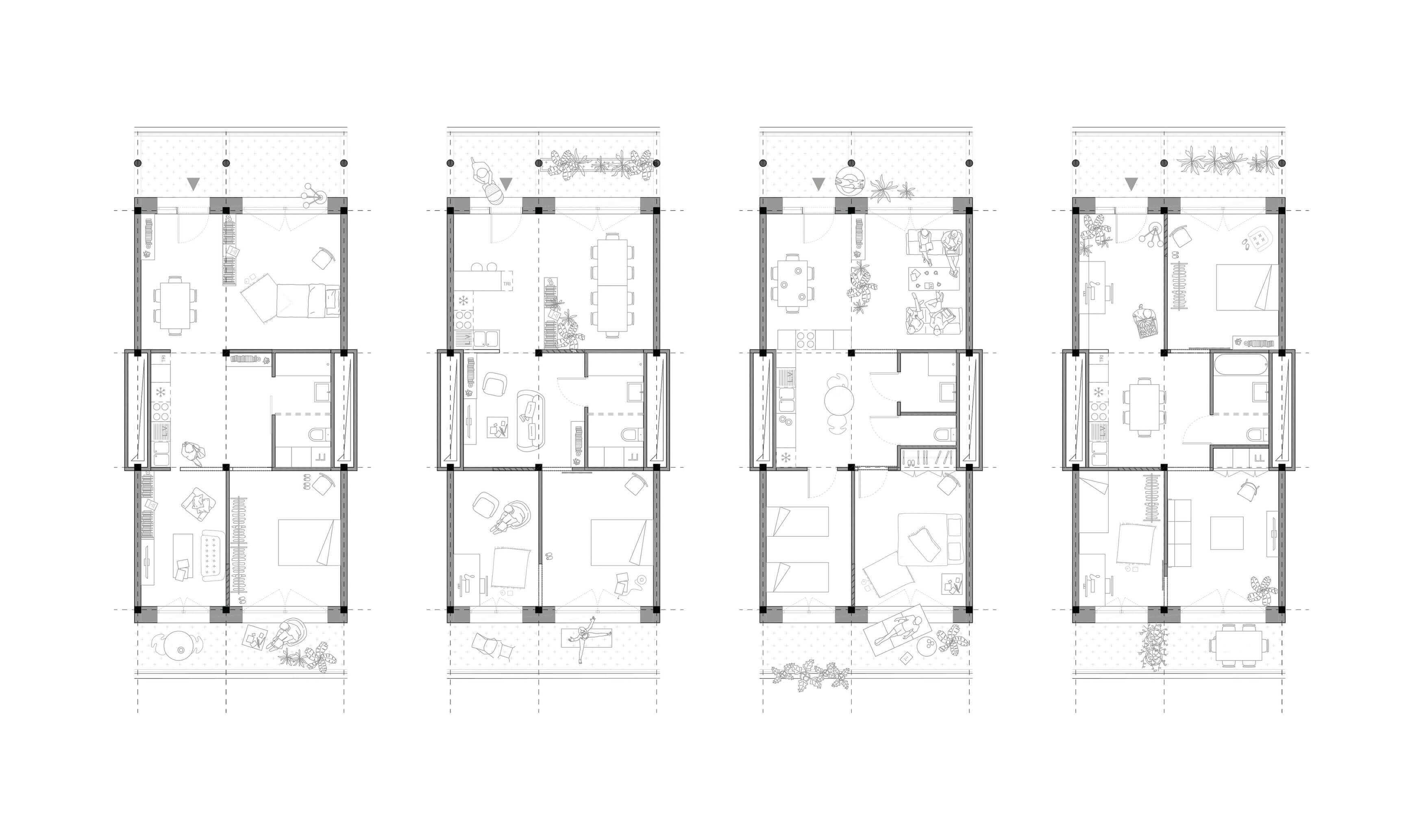 Ces scenarii se construisent autour d'un rapport à l'extérieur ext rêmement diversifié : des galeries, paliers et terrasses partagés permettent des interactions et de multiples appropriations collectives, tandis que des terrasses privatives favorisent une projection de la cellule intime du logement vers le paysage et entretiennent une relation étroite des habitants avec les éléments naturels: les arbres, la lumière, l'air.