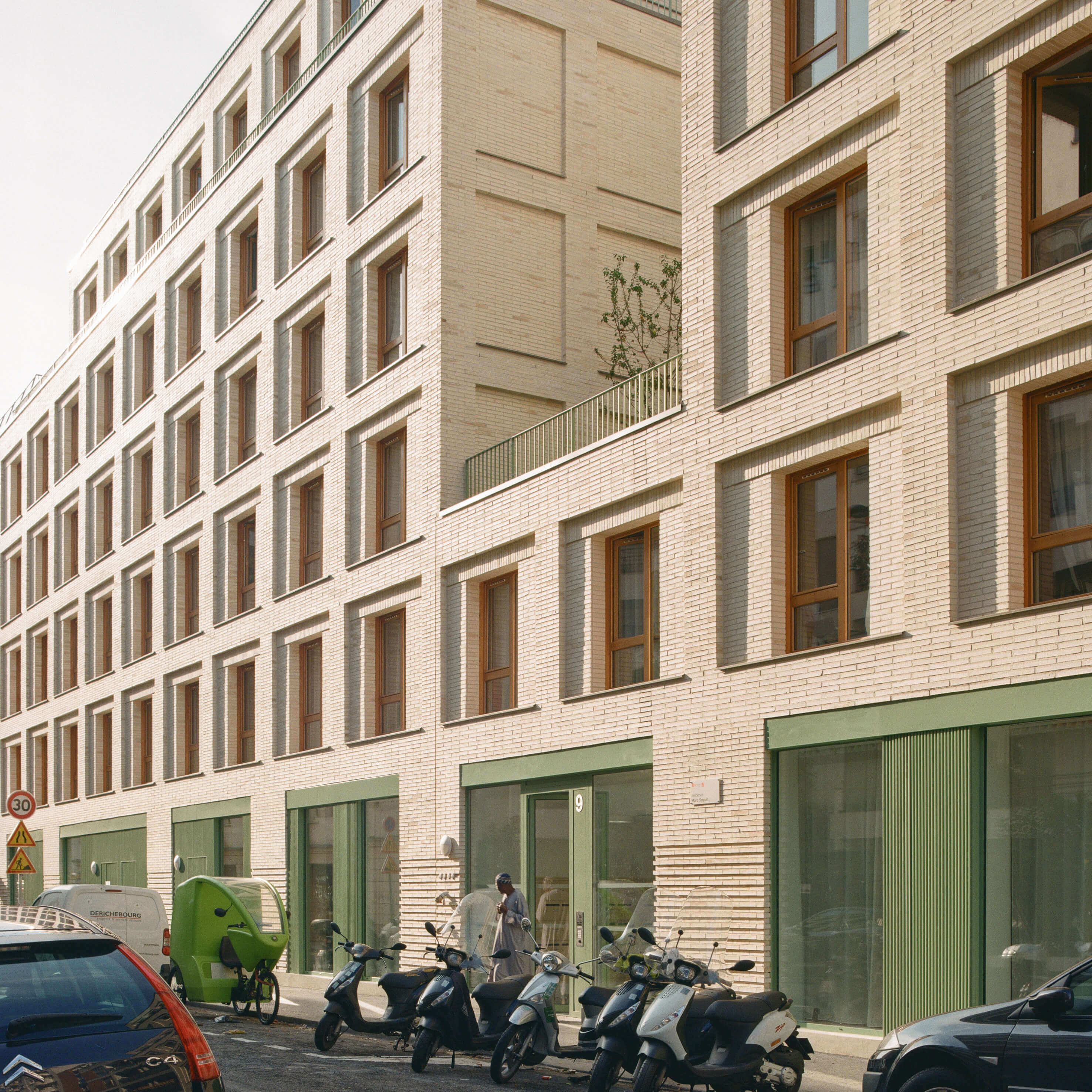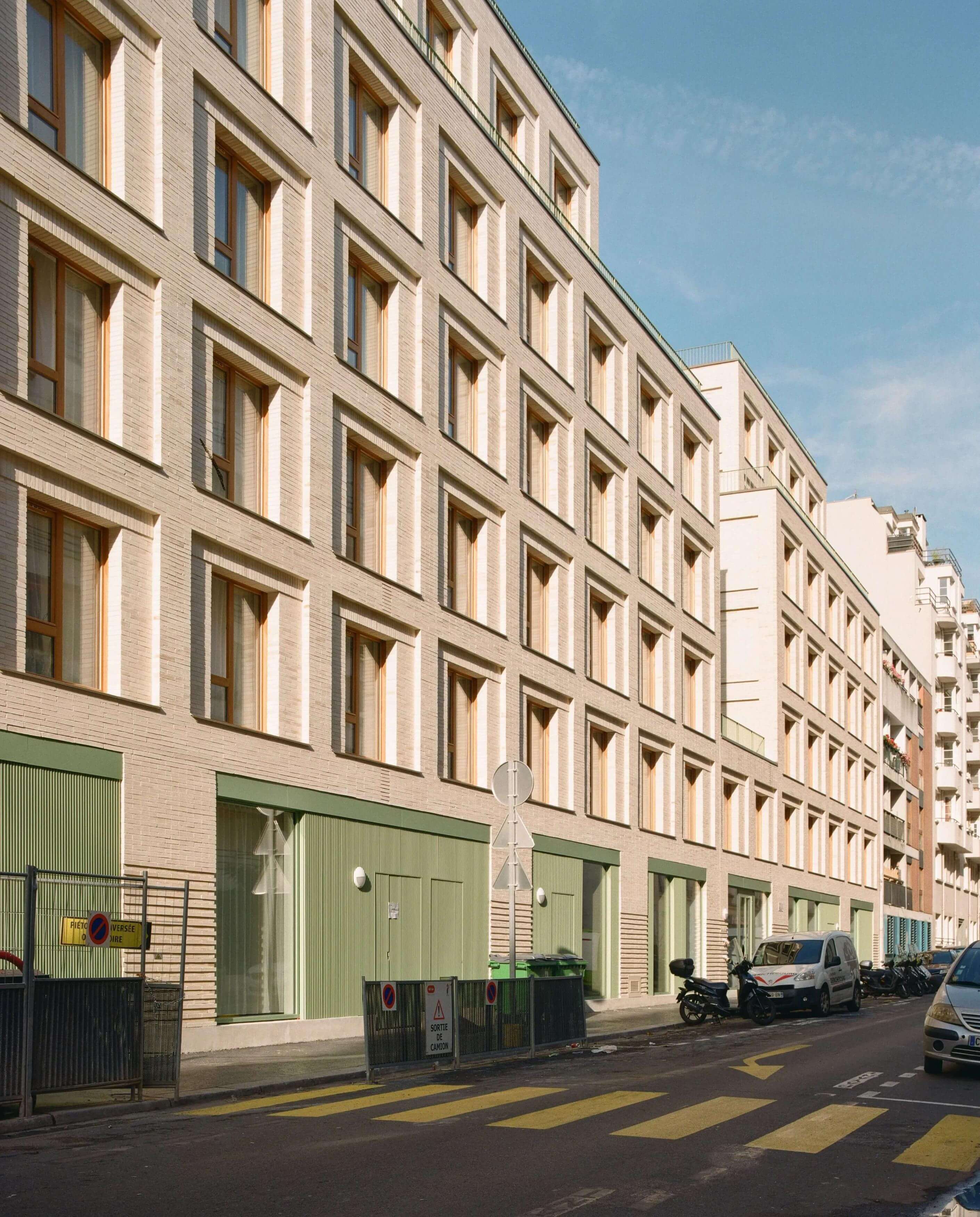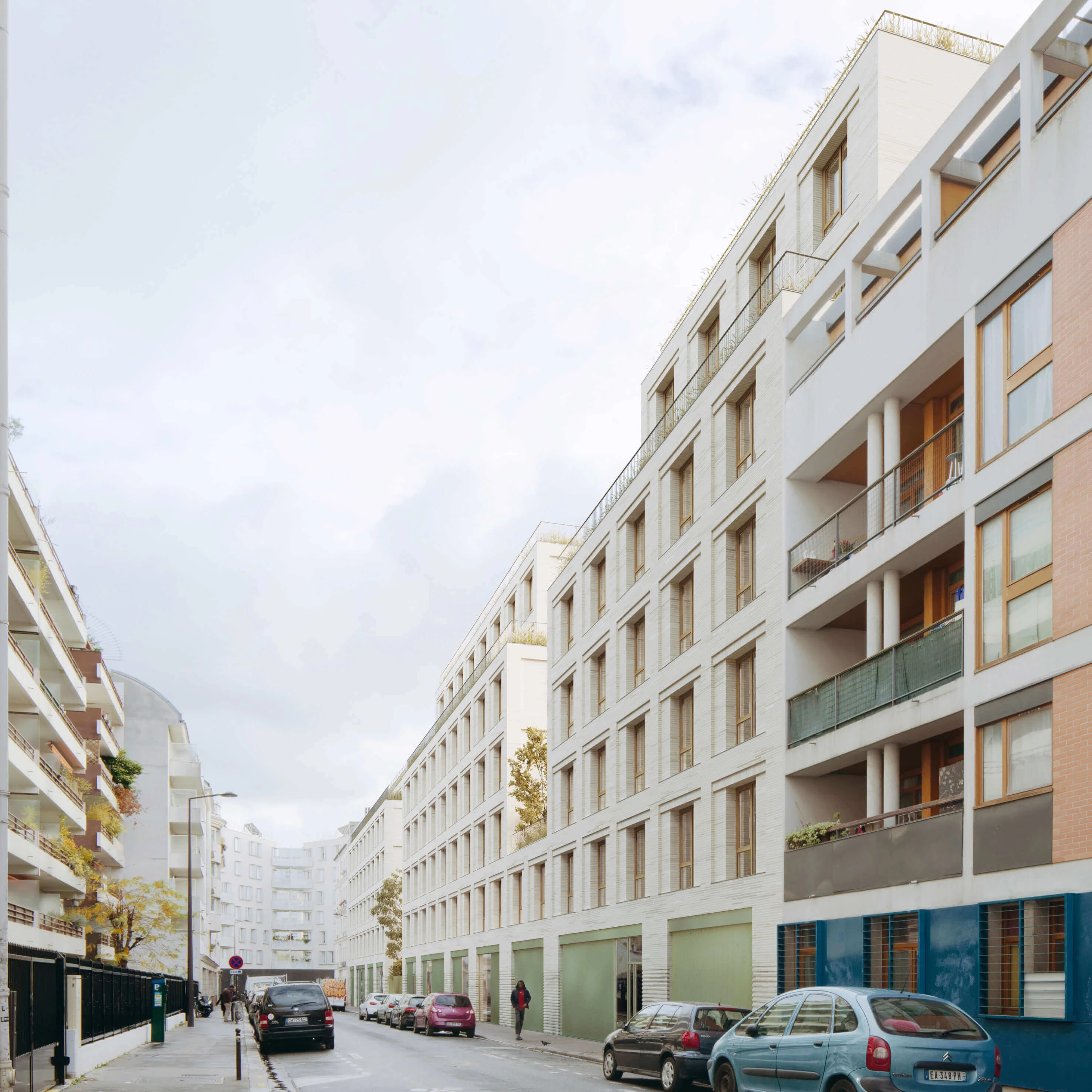 « Côté rue » : ces respirations sont autant d’occasions de rythmer la rue. Orientés nord, l’ombre que portent les bâtiments sur l’espace public est interrompue par la fragmentation du bâti. « Côté jardin » : inaccessible comme demandé, se développe un réservoir de biodiversité favorable à la faune et la flore et permet d’inscrire le projet dans le cadre du nouveau plan de la biodiversité de Paris 2018-2024. Le cœur d’îlot devient un poumon vert, favorable au végétal, limitant les îlots de chaleur en centre urbain et développant la fertilisation des sols. Cette dichotomie du contexte, entre ville et nature, guide également les choix d’une matérialité mixte, tirant parti des qualités premières et intrinsèques des modes constructifs.